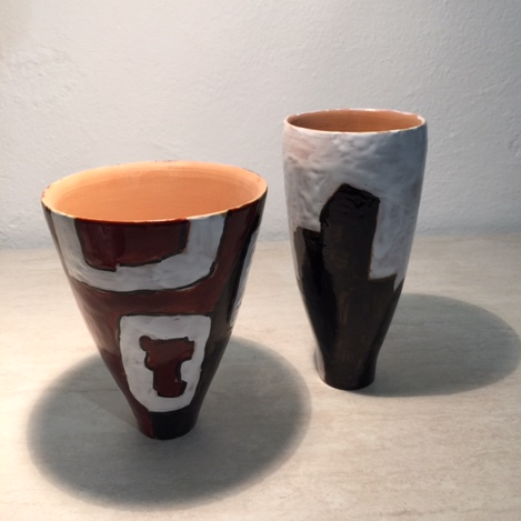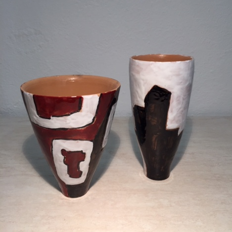 Vasi in terra rossa, lavorati a tornio, smaltati con disegni geometrici.